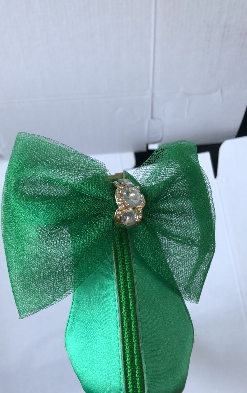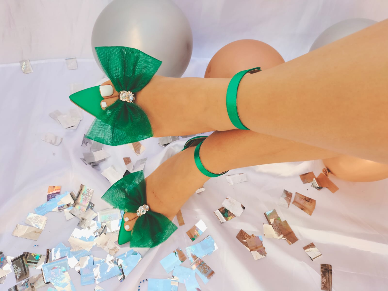material VERDE SHANTUNG, decoración de moño dinámico el cual se puede cambiar de varias posiciones